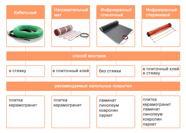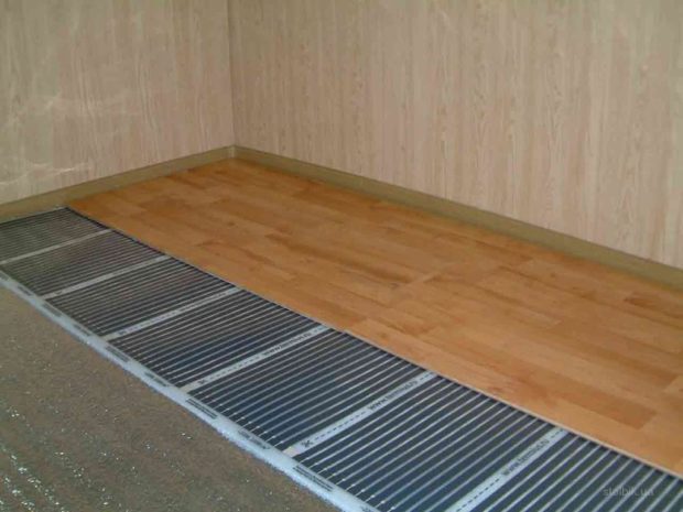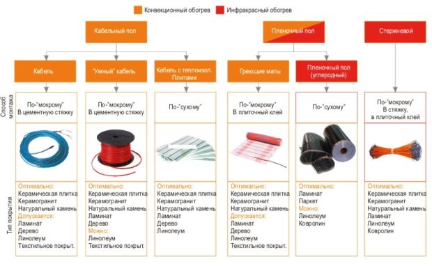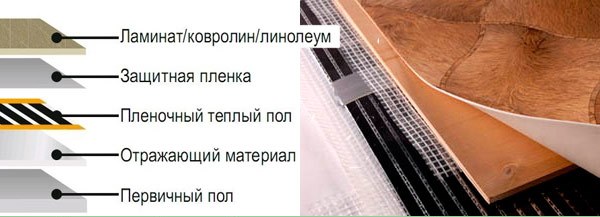 - film. Sa base est un film qui effectue un chauffage selon le principe infrarouge, c'est-à-dire les objets chauffent d'abord, puis l'air. Il est plus facile de monter le film, il occupe un minimum de la hauteur de la pièce, il peut être posé sous revêtement de sol stratifié, moquette, linoléum, planche de parquet;