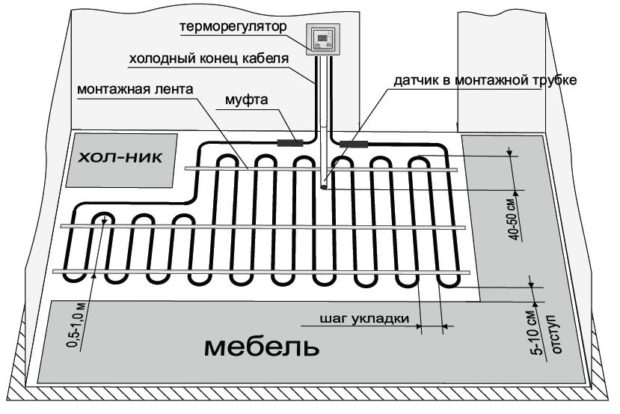 - hauteur de la pièce. Si la pièce est haute et que le fait de la réduire de 8 à 10 cm ne vous dérange pas, vous pouvez installer le plancher du câble (couche d'isolation + câble + chape + matériau de finition = 8 à 10 cm). Si une telle décision cause des inconvénients ou rend chambre basse encore plus bas, puis arrêtez-vous aux thermomats (perte de hauteur jusqu'à 5 cm) ou au film IR (jusqu'à 2 cm);