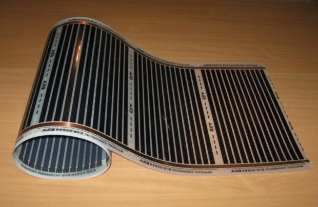 Film IR se compose de deux couches de polyester dense, entre lesquelles se trouvent des barres conductrices en cuivre et des bandes de pâte de carbone. L'épaisseur du film n'est que de 0,4 mm, la largeur du rouleau est de 50 à 100 cm, la longueur peut atteindre 50 cm Le film est posé sur une base propre et uniforme directement sous le revêtement de sol. Il y a des lignes de coupe sur le rouleau, il est donc facile de monter le film dans une pièce de n'importe quelle configuration. Les segments sont interconnectés par des clips de contact. Lors de la pose, 5 à 15 cm s'éloignent des murs, 30 cm des radiateurs Le film n'est pas posé sous des meubles massifs.