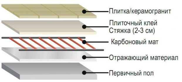 Ce type de plancher fonctionne également sur le principe du rayonnement infrarouge, uniquement à la place d'un film, des tiges parallèles sont utilisées ici. Les tiges sont flexibles, mais elles sont beaucoup plus résistantes que le fragile film IR, ce qui rend le système plus fiable. Les tiges sont empilées ou colle à carrelage. La puissance des tiges de carbone atteint 130-160 W / m2. La largeur du rouleau est de 83 cm, la longueur peut atteindre 20 m et le pas entre les tiges est de 9-10 cm.