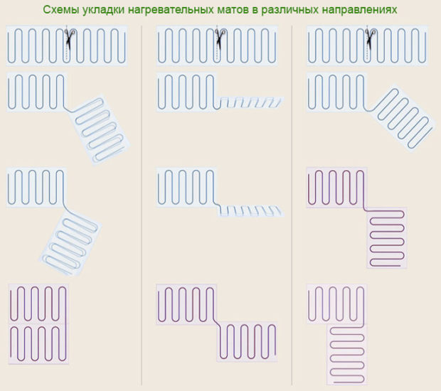 L'installation de tapis chauffants peut être effectuée déjà sur la chape finie. Les thermomètres sont vendus en rouleaux d'une largeur d'environ 50 cm et d'une longueur de 20-24 m. Le câble est déjà posé avec un certain pas, la puissance est indiquée par le fabricant (généralement 100-150 W / m2, moins souvent 200 W / m2), donc vous n'aurez rien à calculer , ainsi que le repérage de l'emplacement du câble sur le sol. Il suffit de faire rouler les tapis sur le sol (en évitant les zones où les meubles massifs se tiendront), de couper le filet à certains endroits (mais ne coupez pas le câble - il le déplie simplement, comme dans la figure ci-dessous), fixez le filet et faites le lien minimum. Vous pouvez vous passer de chape, en utilisant de la colle à carreaux, sur laquelle les carreaux sont éventuellement posés. Vous ne perdez donc pas d'altitude du tout et fixez la grille.