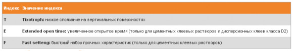Les indices numériques «1» et «2» indiquent les propriétés de composition de base (1) ou améliorée (2). Adhésifs de dispersion étiquetés D1 et D2: le premier a des propriétés d'adhésion plus faibles, le second - plus élevé. Adhésifs polyuréthane et époxy sont désignés par R1 et R2.
