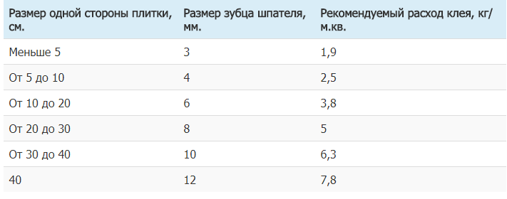- outil utilisé. Les spatules à dents en V sont considérées comme les plus économiques en termes de déchets de colle, en forme de U se montrent également bien, mais le plus souvent l'outil a une forme de dent carrée. La taille de la dent dépend de la taille de la tuile (plus la tuile est grande, plus les dents sont grandes), ce qui affecte également le débit du mélange. Cependant, si la surface est inégale, la consommation de colle sera supérieure à celle indiquée dans le tableau.