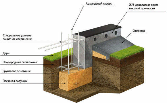 Pour que le jardin d'hiver ne s'affaisse pas, il vaut mieux s'occuper de la construction fondation solide. C'est une partie assez longue et coûteuse de l'ensemble du projet - il faut environ un cinquième du budget pour créer la fondation. S'adaptera fondation en bande peu profonde. Vous pouvez utiliser des blocs de béton armé ou armé prêts à l'emploi d'une épaisseur de 20 cm pour le créer.La profondeur dépend du type de sol, du climat et de la topographie. Au lieu de blocs prêts à l'emploi, vous pouvez utiliser mortier de bétonmais vous devez travailler dur avec le coffrage et la cage de renforcement.