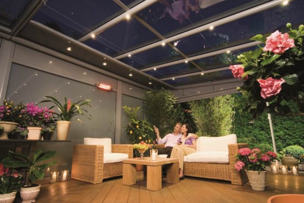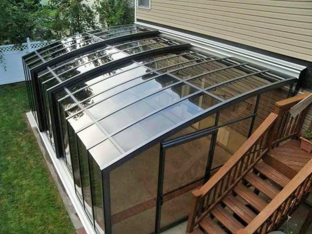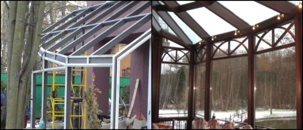 - protection externe permet d'assurer une protection à 90%. Les auvents et les auvents pour une telle protection sont faits d'un tissu spécial qui réfléchit la lumière, de sorte que ni la lumière excessive ni la chaleur excessive ne pénètrent dans le jardin d'hiver. Pour les régions chaudes du sud, une telle protection est particulièrement nécessaire si des plantes sensibles à l'ombre sont cultivées.