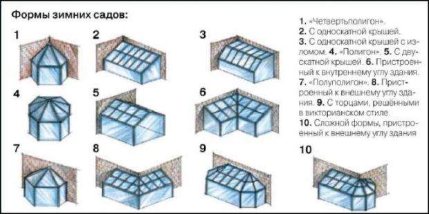 Jardin d'hiver peut être réalisé comme un bâtiment séparémais cette option est rare. Il jouxte généralement la maison, et dans ce cas, la conception peut avoir forme différente: