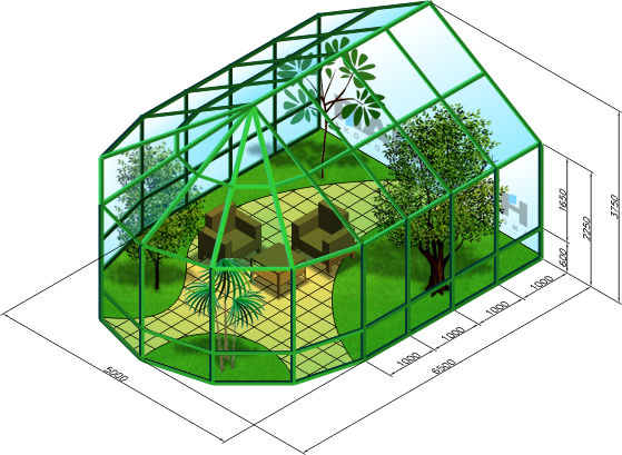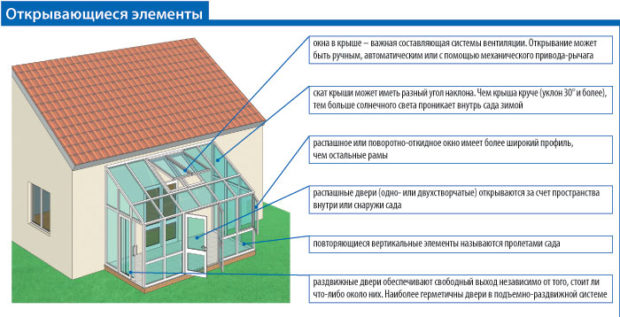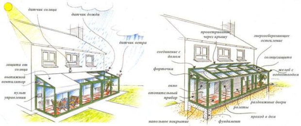 - la conception attachée à l'angle extérieur de la maison vous permet d'agencer plusieurs groupes de plantes dans le jardin qui nécessitent des conditions différentes en termes de lumière et de température;