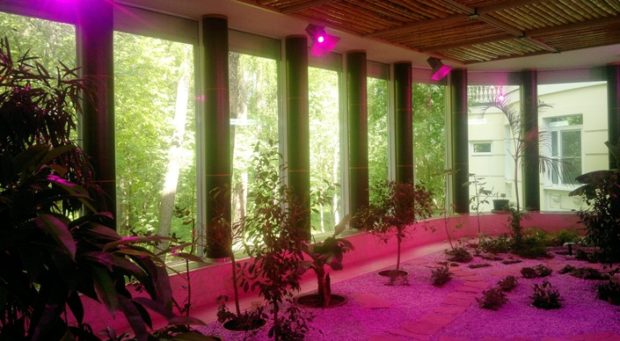 Un jardin d'hiver dans une maison privée a besoin lumière artificielle, car en hiver, la lumière du soleil peut ne pas être suffisante pour la croissance et le développement normaux de la verdure. Devra prendre soin de câblage et étudier le spectre lumineux de différents types de lampes pour choisir les bonnes. Pour assurer la photosynthèse, il est nécessaire que la lampe émette des rayons dans la gamme 400-500 nm (spectre bleu), 500-600 nm (vert, pour la photosynthèse des feuilles inférieures), 600-700 nm (rouge). La lumière de 1200 à 1600 nm accélère de nombreuses réactions biochimiques.