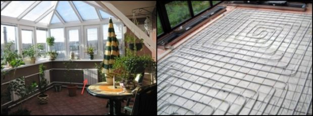 - plancher chaud (de l'eau ou électrique) vous permet de chauffer la pièce de manière optimale. Le sol et l'eau pour l'irrigation seront chauffés en premier. Si vous posez correctement le câble ou les tuyaux, les murs du jardin se réchaufferont également, ce qui empêchera leur givrage. Les inconvénients incluent le coût de cette méthode.Il sera difficile de réparer le système d'eau, sa disposition est un processus complexe. Le chauffage au sol électrique est plus facile à organiser, mais le coût de son entretien sera plus élevé;