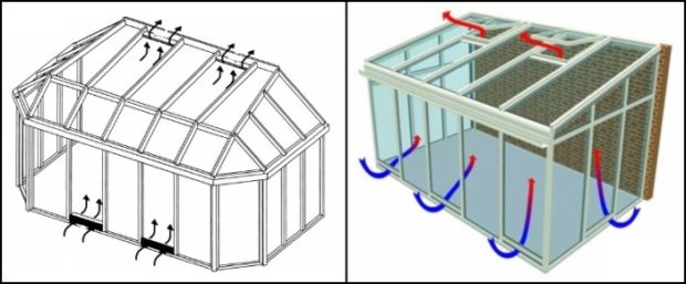 Les plantes ont besoin d'un apport d'air frais - c'est la clé de leur vie normale. Il est nécessaire de prévoir le cheminement de l'air de la rue vers le jardin, ainsi que l'évacuation de l'air du jardin. Il n'y a que deux options: