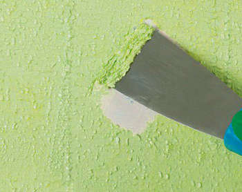 - lorsque la toile est suffisamment saturée d'eau et commence à s'éloigner légèrement de la surface, elle peut être arrachée avec une spatule et commencer à se déchirer. Il vaut mieux arracher les coutures. Si certaines zones ne répondent pas, humidifiez-les à nouveau;