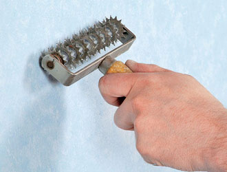 - pour une meilleure pénétration de l'eau à l'intérieur du papier peint et sous le papier peint, la couche supérieure peut être perforée avec un rouleau à aiguille, un couteau ou un papier peint tigre. Si le papier peint a une couche de protection hydrofuge, vous ne pouvez pas vous passer de cette astuce;