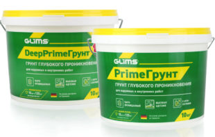 Pour préparer les murs dans n'importe quelle pièce, les apprêts Glims DeepPrimeGrunt et GLIMS PrimeGrunt sont parfaits, ce qui non seulement renforce la base, améliore l'adhérence et économise la peinture ou la colle, mais protège également la surface contre les moisissures et les champignons en raison de l'antiseptique qui fait partie de la composition. L'apprêt peut être appliqué sur presque toutes les surfaces, il sèche rapidement (4 heures) et a une faible consommation (0,08-0,2 kg / m2).