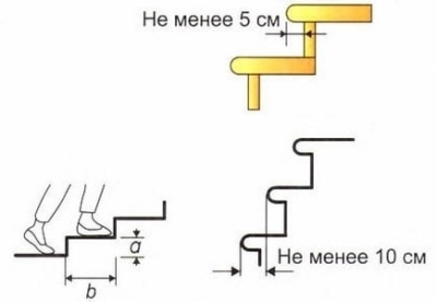 - optimal largeur de marche - 30 cm (au moins 27 cm à coup sûr), mais cela est difficile à réaliser dans une zone limitée, alors ils vont souvent à l'astuce, augmentant la surface de chaque étape en raison de la partie saillante au-dessus de l'étape inférieure. La longueur de la partie en saillie ne doit pas dépasser 5 cm et l'espace libre (sans dépasser l'élément supérieur) doit être d'au moins 10 cm;