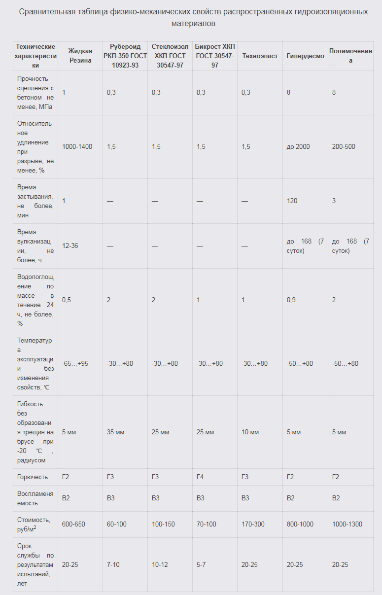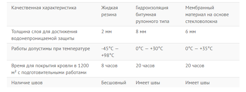 Si vous avez des questions, les tableaux vous aideront à faire une impression complète de caoutchouc liquide et à le comparer avec d'autres matériaux d'étanchéité populaires.