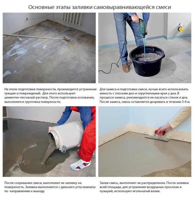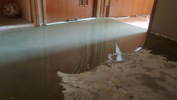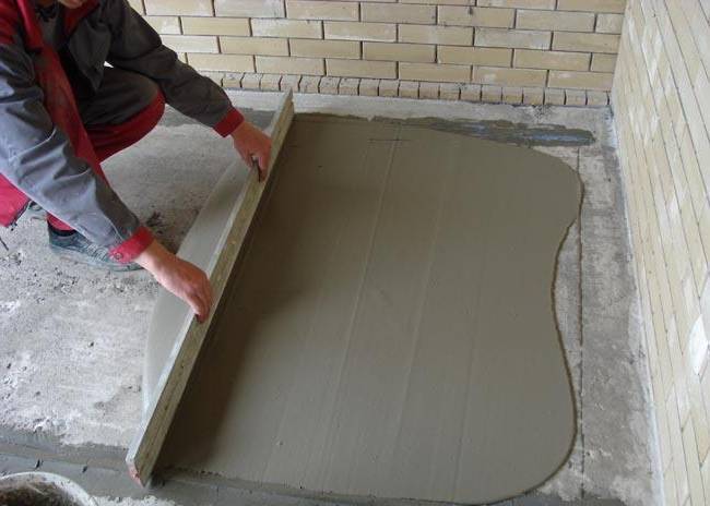 - la solution finie est appliquée en bandes, égalisées avec une règle ou une racle. L'emballage indiquera combien de temps vous devrez attendre pour pouvoir marcher sur la chape et équiper le revêtement. Les détails sont décrits dans la vidéo.