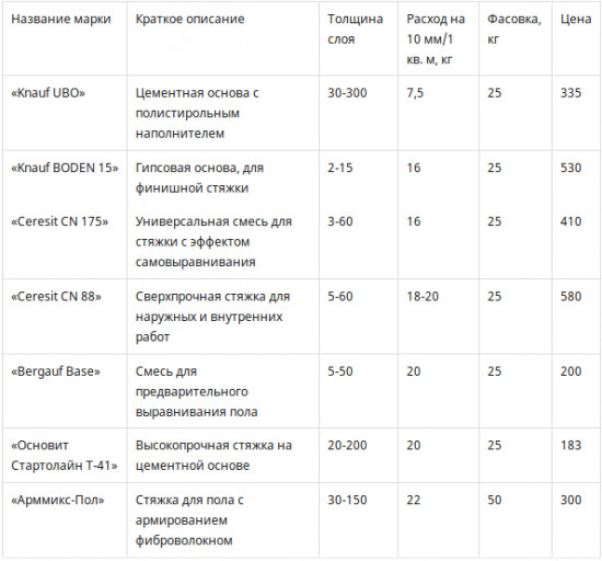 - vaste choix de composés prêts à l'emploiafin que vous puissiez choisir la solution la plus appropriée pour les pièces sèches et humides, ainsi que trouver une chape qui sèche rapidement les enregistrements ou qui a des propriétés d'auto-nivellement.
