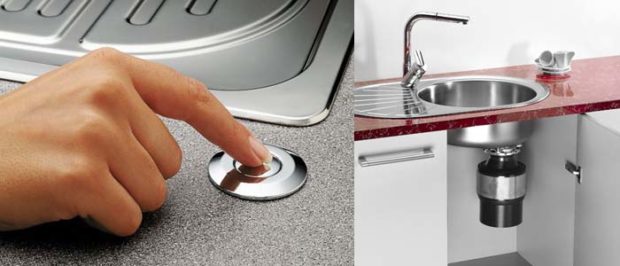 - réglage d'un bouton ou d'un bouton pneumatique. Ce dernier fonctionne sans électricité, donc plus sûr. Un tuyau est installé entre le bouton pneumatique et le broyeur.Le bouton pneumatique peut être installé dans l'évier ou sur le comptoir, pour cela il faudra percer un trou;