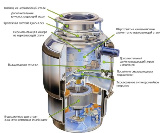 Les disques rotatifs et les cames de broyage sont situés dans le boîtier en métal ou en plastique du broyeur, qui presse les déchets entrants vers les parois rigides et fixes de la râpe. L'entrée est attachée au drain dans évier de cuisine, sortie - vers tuyau d'égout. Les déchets entrants sont broyés et broyés, après quoi ils sont rejetés dans les égouts. Pour commencer, appuyez simplement sur le bouton (modèles électriques), et certains modèles sont équipés d'un mécanisme de commutation à distance.