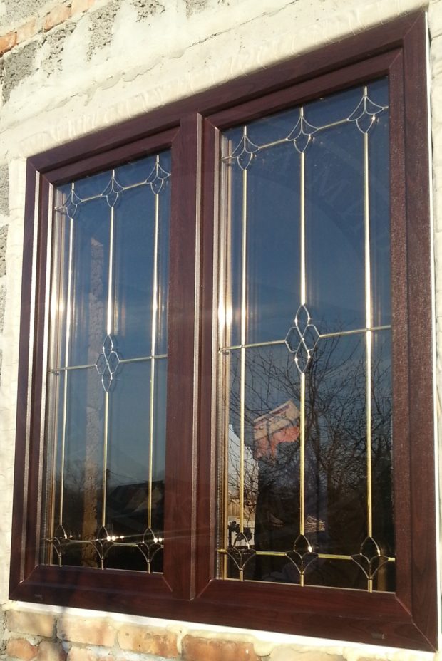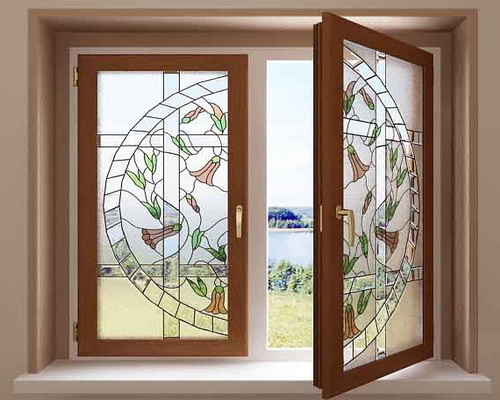 - vitrail - ce n'est pas seulement cher, mais aussi assez difficile, au sens littéral du terme. Il ne peut résister profil en aluminium. Moins cher et plus facile à simuler des vitraux. La technique de la «face de diamant» aura l'air plutôt bonne lorsqu'une partie ou la totalité de la surface intérieure du verre est recouverte d'un ruban spécial qui imite un biseau et que le paquet de verre commence à scintiller. En production, le vitrail est parfois imité à l'aide de films et de broches en étain. Le verre avec un motif est placé à l'intérieur d'une fenêtre à double vitrage, en conséquence, tout semble naturel;