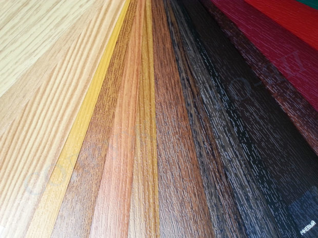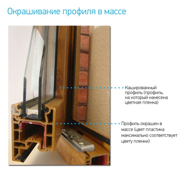 - Coloration en vrac réalisée au stade de la fabrication du profil par ajout de pigment coloré. De cette façon, la surface la plus résistante aux influences extérieures peut être obtenue. Le choix des nuances est limité, souvent un profil brun est produit de manière similaire.