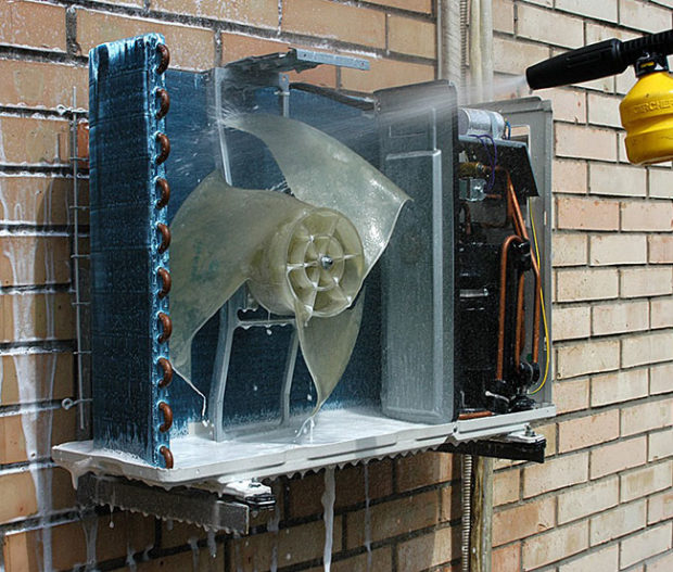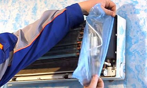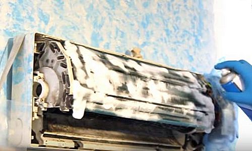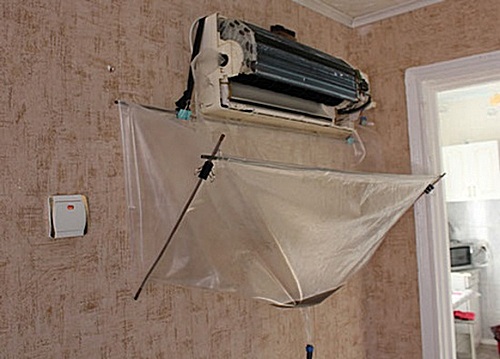 C'est la partie la plus difficile, car vous devez travailler là où le climatiseur est installé. Le rinçage implique l'utilisation de moyens spéciaux et d'une grande quantité d'eau, de sorte que les murs, le sol et l'unité électrique du climatiseur doivent être protégés de manière fiable.