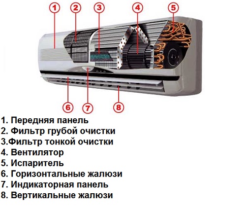En plus des filtres, il y a aussi un ventilateur et un évaporateur à l'intérieur de l'unité. L'évaporateur contient du fréon, il refroidit l'air, qui est transporté dans l'appartement avec un ventilateur. L'air frais sort par des stores verticaux et horizontaux. Il y a un bac d'égouttement sous l'évaporateur, qui sort ensuite par le système de drainage. Le panneau indicateur sert à simplifier l'interaction de l'utilisateur avec l'appareil. La carte électronique est le cerveau du climatiseur, et les connexions de mamelon relient les parties externes et internes du système et servent à faire circuler le réfrigérant.