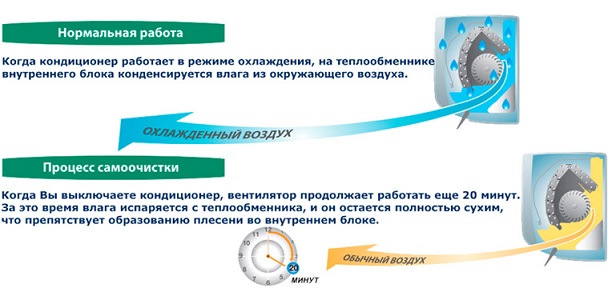 De nombreux modèles modernes sont capables de se maintenir dans un état relativement propre. Cette fonction fonctionne très simplement: l'air passe à travers les filtres et sèche tous les éléments du système. Il s'agit d'une excellente prévention de l'apparition d'odeurs brutes et moisies. Cependant, même un tel système ne dispense pas complètement de la nécessité de nettoyer complètement le climatiseur.
