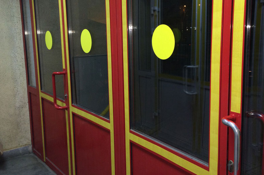 Il est recommandé d'utiliser des portes d'entrée coulissantes avec un détecteur de mouvement. Pour les ouvertures totalement ou partiellement transparentes, un marquage spécial à l'aide d'un ruban de contraste est nécessaire. Des cercles ou des carrés de couleur vive (de préférence jaune) sont collés aux ouvrants. Les contours des portes avec un ruban de couleur similaire sont également mis en évidence.