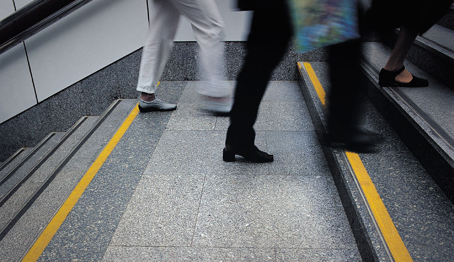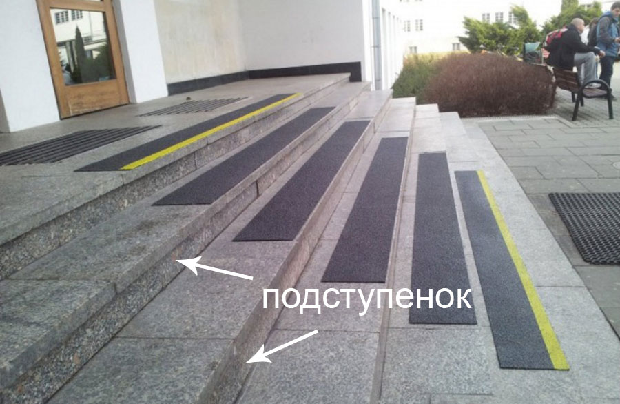 Les marches elles-mêmes doivent avoir des patins ondulés antidérapants. Il est recommandé d'installer des plaques jaunes sur les marches les plus basses et les plus hautes de la travée, et des noires sur les marches intermédiaires. Il est préférable d'utiliser une bande tactile avec un corps en aluminium à ces fins, elle dure le plus longtemps.