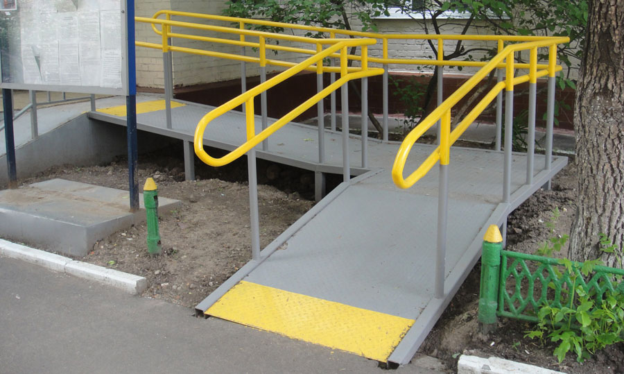 A l'entrée du bâtiment, s'il y a un escalier, une rampe d'accès en fauteuil roulant doit être équipée. L'inclinaison de l'une des sections de la rampe ne doit pas dépasser les normes établies. Il est également nécessaire de respecter la largeur de levage recommandée et d'installer des mains courantes des deux côtés. Après chaque marche, vous avez besoin d'une plate-forme qui vous permet de tourner et de faire demi-tour.