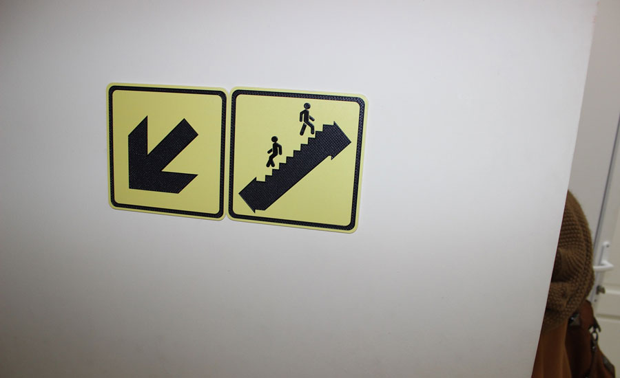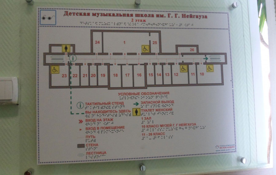 La direction du mouvement vers des objets importants (toilettes, parking, etc.) est indiquée par le montage de pictogrammes tactiles sur les murs.