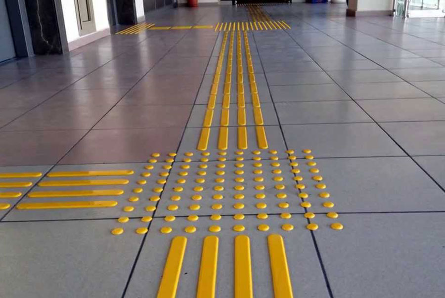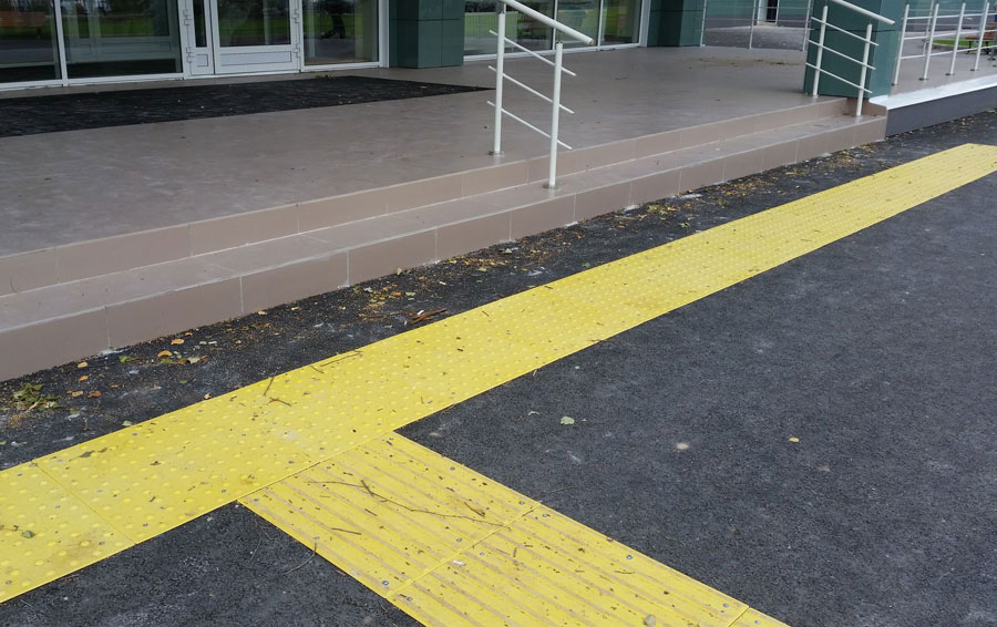 Des dalles tactiles en béton noir ou jaune doivent être dessinées sur le bâtiment. Idéalement, il devrait s'éloigner du chemin tactile du trottoir et conduire à groupe d'entrée (véranda). Cependant, les chemins tactiles sur les trottoirs ne sont pas omniprésents, il suffit donc d'amener la tuile quelque part au milieu de la zone piétonne.