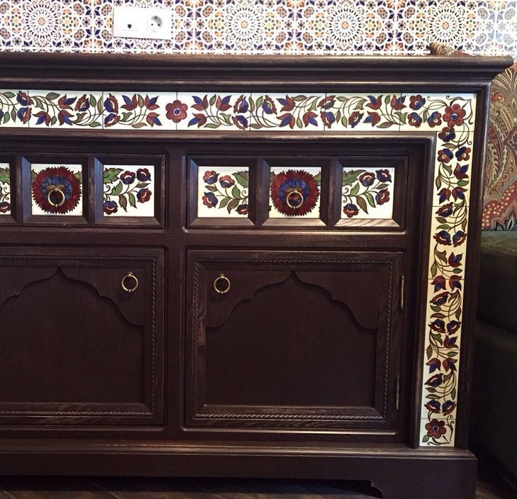 Après réparation, presque tout le monde a les restes de la tuile. Beaucoup de matériel pour cette méthode n'est pas nécessaire, car même l'achat nouvelle tuile ne frappera pas le budget. Bien sûr, toutes les façades ne sont pas recouvertes de carreaux. Un fragment avec un beau motif peut être collé au centre. Il peut s'agir d'une tuile ou de quatre petites tuiles, disposées sous la forme d'un carré ou d'un losange. Des carreaux fins peuvent être disposés sur les contours des armoires. Souvent, cette décoration est utilisée pour décorer le bord inférieur ou supérieur du casque. L'image sur le carreau doit correspondre au style général de la cuisine.