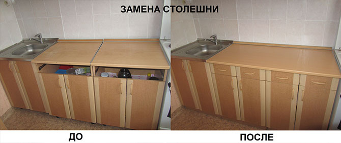 Rafraîchissez les façades et laissez le comptoir sans surveillance - cela signifie de ne pas terminer le travail. Plan de travail - la partie la plus vulnérable de la cuisine, car sa surface est constamment exposée aux gouttes d'eau et de graisse, aux contraintes mécaniques, aux températures élevées. Les panneaux de particules en aggloméré souffrent généralement en premier et lorsque la façade semble encore plus ou moins normale, la surface de travail laisse beaucoup à désirer.
