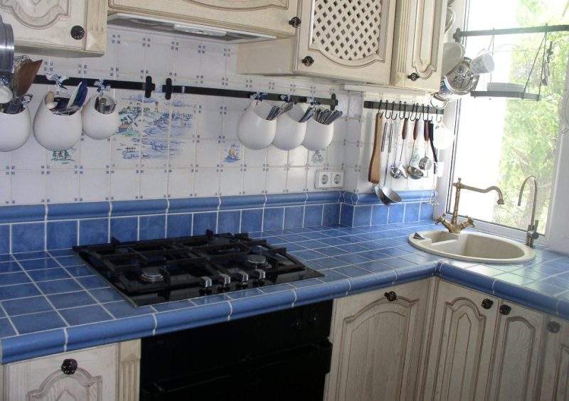 - carrelageet utilisent généralement des carreaux de la couleur de celui qui est doublé tablier de cuisine. Le carreau est facile à nettoyer, n'a pas peur de l'humidité et des températures élevées, relativement facile à installer. Cependant, le poids du casque augmentera considérablement. Si le cadre est faible, il ne peut pas le supporter. Commencez le travail en fixant un coin métallique autour du périmètre du comptoir. Le carreau est posé sur un adhésif à carreaux ordinaire, les écarts sont minimisés. La colle sèche rapidement, il est donc préférable de ne pas couvrir tout le comptoir à la fois. Il ne reste plus qu'à essuyer les coutures et ouvrir le carreau avec une couche protectrice de vernis. De même travailler avec mosaïque;