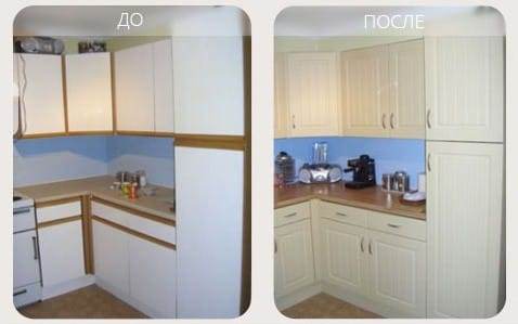 Ce sera plus facile pour les propriétaires meubles modulaires, qui a été acheté relativement récemment. Ensuite, vous pouvez acheter les façades de la taille requise et les remplacer vous-même. Mais ce n'est pas si chanceux, car il faut généralement faire des façades sur commande. Il n’est pas du tout nécessaire de changer les portes en bois en portes en bois et les panneaux de particules en panneaux de particules. Le caractère unique de cette méthode de restauration réside précisément dans le fait que l'apparence du casque peut être radicalement modifiée en utilisant des matériaux complètement différents.
