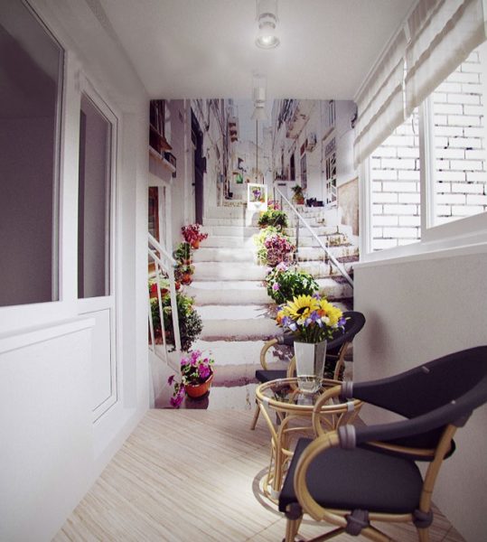 Papier peint - La meilleure façon d'agrandir visuellement un balcon ou une loggia. Si vous utilisez une image avec une perspective, vous trouverez un résultat étonnant. Les meilleurs résultats peuvent être obtenus en soutenant l'image avec un décor. Par exemple, si une photo montre un escalier avec des pots de fleurs à chaque étape, une fleur lumineuse n'interfère pas avec le sol.