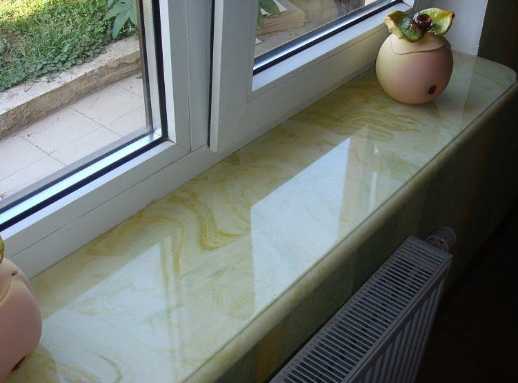 Habituellement les appuis de fenêtre font en plastique. Il est peu coûteux, relativement esthétique, mais pas très durable et même en quelque sorte ennuyeux. Un rebord de fenêtre en pierre naturelle sera beaucoup plus élégant, durera des décennies, mais vous devrez payer un montant élevé. Une solution de compromis est le rebord de fenêtre en pierre artificielle. Le matériau est composé de charge minérale, de polymère, de colorants et de divers additifs. Le résultat est un produit difficile à distinguer par son aspect de la pierre naturelle. Fait intéressant, la technologie a été créée en 1967 et était à l'origine nécessaire pour les prothèses osseuses, et ce n'est qu'à ce moment-là qu'elle a commencé à être utilisée dans la construction.