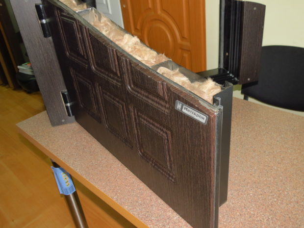 - laine minérale se distingue par de bonnes qualités d'isolation thermique et acoustique, mais au fil du temps, il s'égare et s'affaisse, ce qui aggrave la qualité de l'isolation. Pour éviter cela, vous devez utiliser une caisse supplémentaire, mais dans les portes bon marché, en règle générale, personne ne le fait. Malgré cet inconvénient, la laine minérale est considérée comme l'isolant le plus populaire et est souvent utilisée non seulement dans les portes bon marché, mais aussi dans de nombreux échantillons de catégories de prix moyen et élevé;