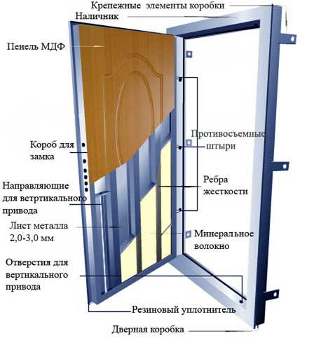 Le panneau extérieur est toujours en acier, l'intérieur peut être en acier ou en d'autres matériaux (par exemple, MDF). Entre ces panneaux, des raidisseurs renforcent la résistance et les caractéristiques anti-effraction de la porte.
