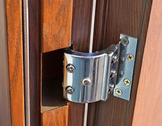 - charnières. S'ils ne sont pas fiables, même le château le plus rusé ne vous sauvera pas. L'option la plus populaire est les charnières externes habituelles, mais elles sont faciles à couper, car récemment, dans de nombreux produits, elles ont commencé à être complétées par des barres transversales anti-amovibles. Même si les boucles extérieures sont coupées, la toile restera en place. Les charnières cachées ne sont pas visibles de l'extérieur de la porte et il est donc impossible de les endommager. Moins - ils peuvent se coincer. Dans les portes bon marché sont rares. Le nombre optimal de boucles est de 2;
