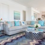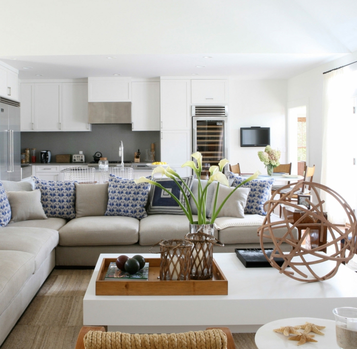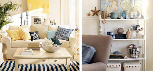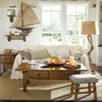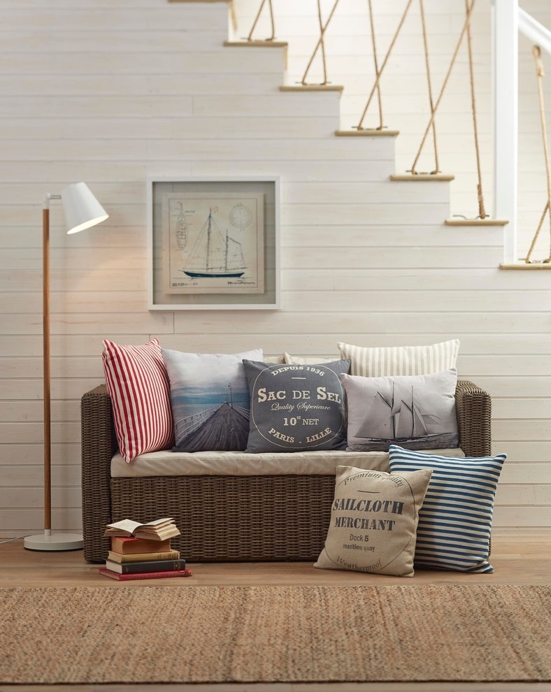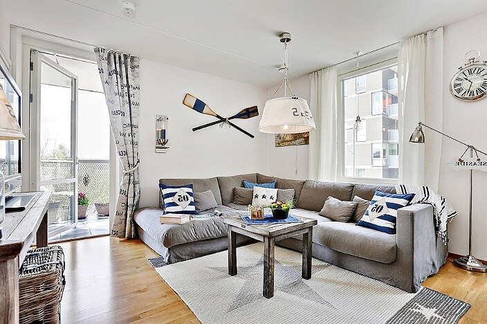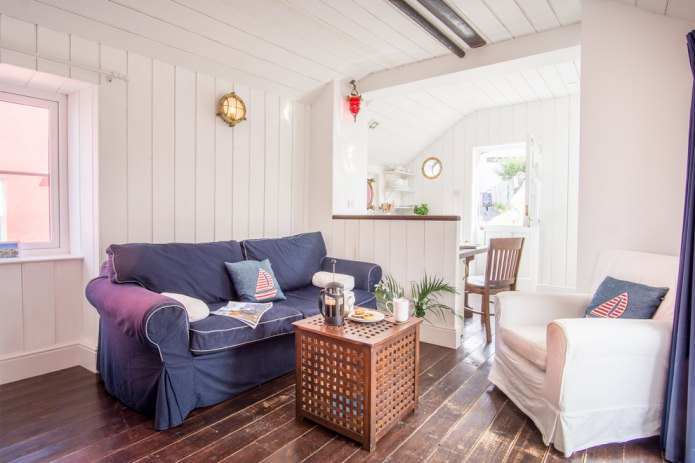 - salon saturé d'humeur marine, si vous utilisez des textiles adaptés (oreillers et plaid), des meubles légers, des photos ou des peintures, des accessoires;