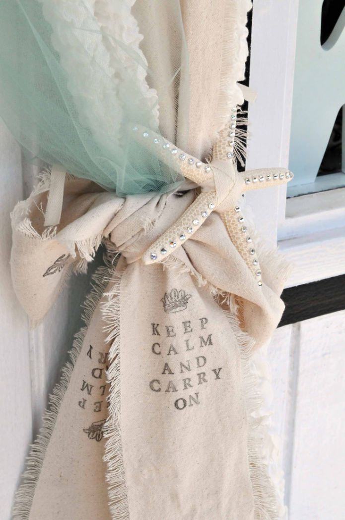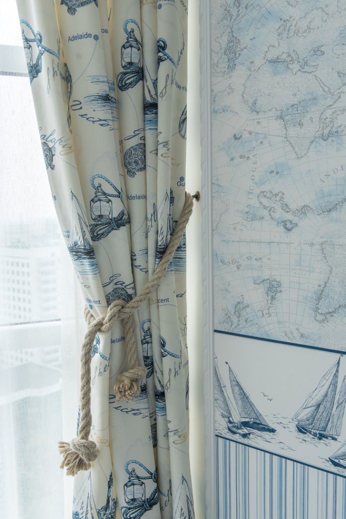 La préférence est donnée tissus naturels. À choisir des rideaux faites attention aux produits les plus simples. Les stores romains et à enrouleur conviennent, un tulle léger translucide avec des rideaux bleus aura fière allure. Les rideaux à draperies complexes, ainsi que les lambrequins sont préférables à ne pas utiliser.Vous pouvez utiliser une corde comme ramassage pour les rideaux, et si vous le souhaitez, vous pouvez décorer la corde avec des accessoires marins, tels que des coquilles ou des ancres.