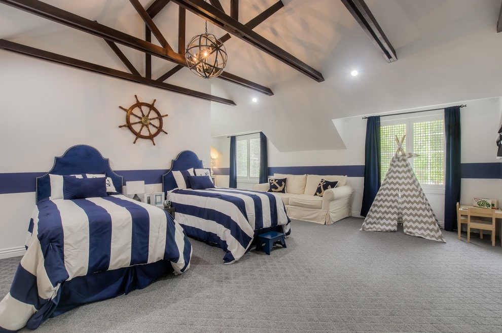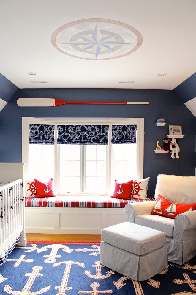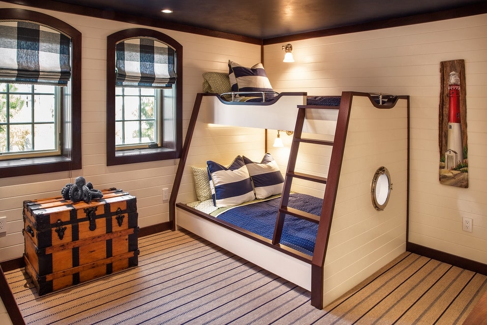 - pour chambre enfant il vient d'être prescrit par le médecin, surtout si vous concevez une chambre pour le garçon. Ils aiment souvent le thème des aventures en mer, des pirates et des trésors. Si l'endroit le permet, alors dans la salle, vous pouvez organiser un fragment du pont du navire - ce sera un endroit préféré pour les jeux de l'enfant et de ses amis. Les marches du lit superposé peuvent également être conçues en conséquence et le mur peut être décoré d'une ancienne carte. La chambre de la fille peut être rendue plus tendre en utilisant des images de sirènes et d'habitants de la mer. Laissez-vous inspirer par les exemples de photos;