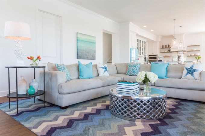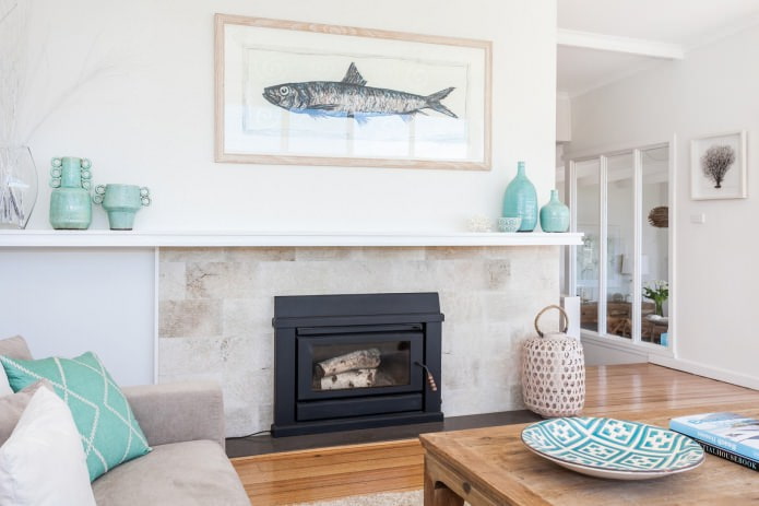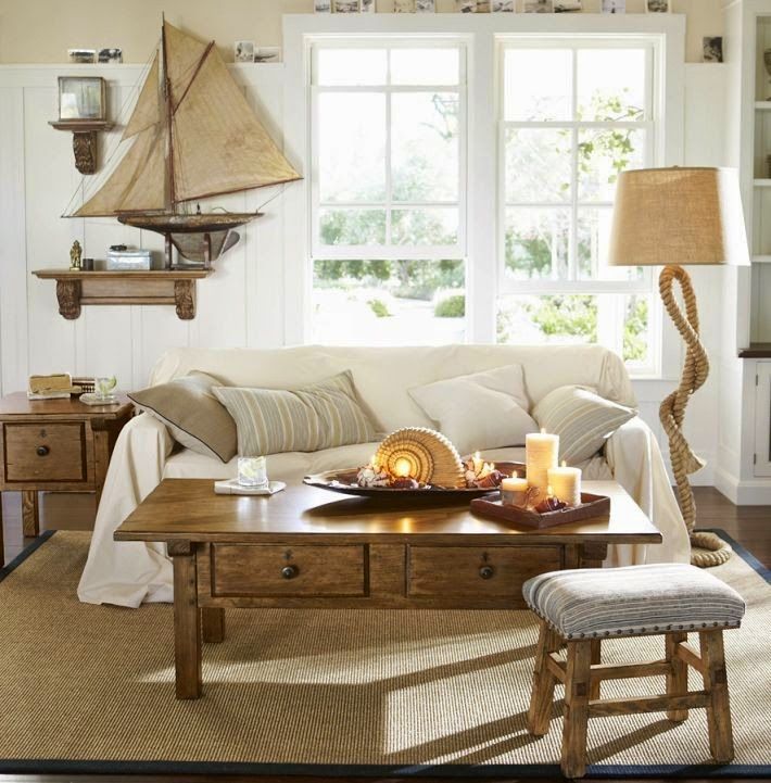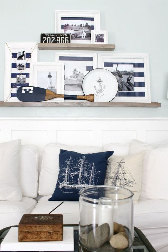 - salon saturé d'humeur marine, si vous utilisez des textiles adaptés (oreillers et plaid), des meubles légers, des photos ou des peintures, des accessoires;