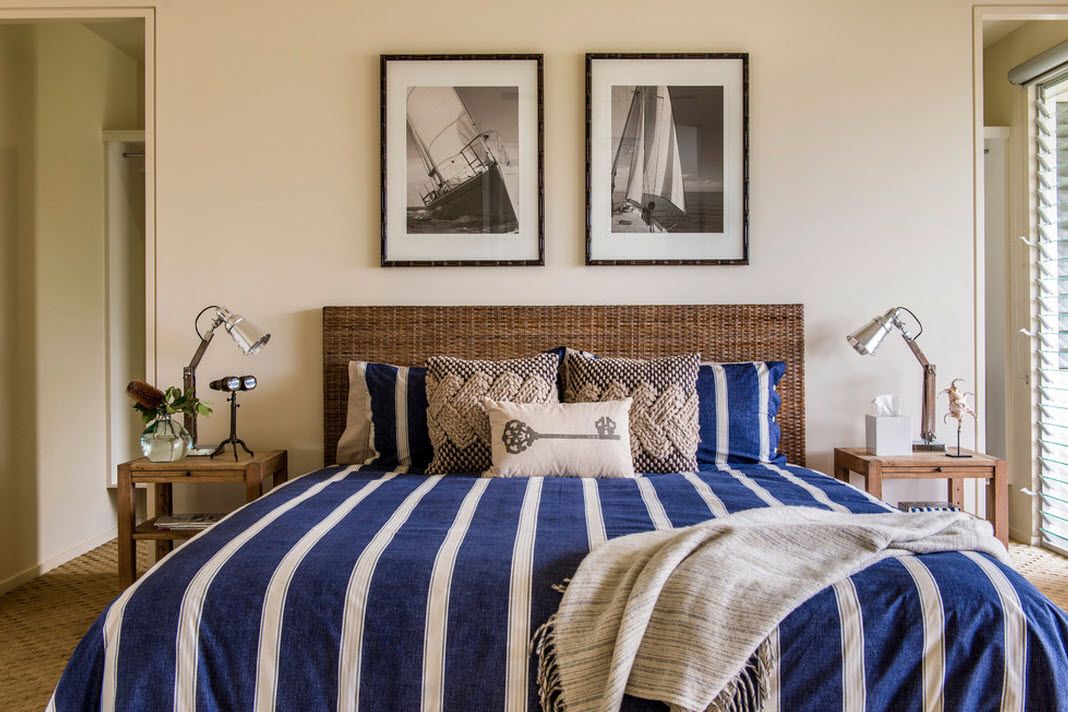 Dans la chambre, le style marin peut être recréé grâce à un linge de lit. Il ne reste plus qu'à accrocher une photo ou à utiliser quelques éléments de décoration caractéristiques - et la pièce se transformera instantanément en cabine.