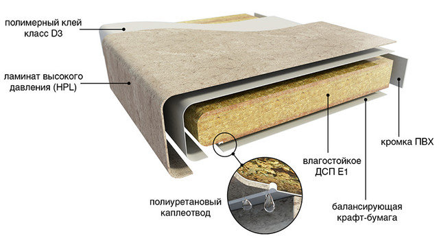 La plupart des plans de travail en stratifié HPL proposés sont il s'agit d'une plaque d'aggloméré enveloppée de plastique jusqu'à 1 mm d'épaisseur. Il est conseillé que le panneau de particules soit complètement enveloppé dans du plastique, car il existe des options lorsque le plastique n'atteint que le fond. Dans ce cas, le panneau de particules peut souffrir de grandes fuites.