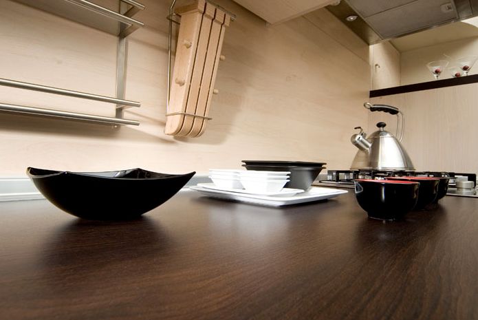 Lors du choix d'un plan de travail design faites attention au bord. Si la cuisine a des lignes droites, le plastique est monté sur le panneau de particules en utilisant la méthode de postformage, c'est-à-dire le bord sera exactement le même que le comptoir. Si un plan de travail incurvé est sélectionné, le bord est fermé avec de l'aluminium, du plastique ou de la mélamine. Les fabricants essaient de sélectionner la couleur et la texture aussi précisément que possible.