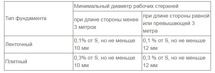 - le diamètre de l'armature de travail dépend de la section transversale de la fondation (S), les données sont données dans le tableau;